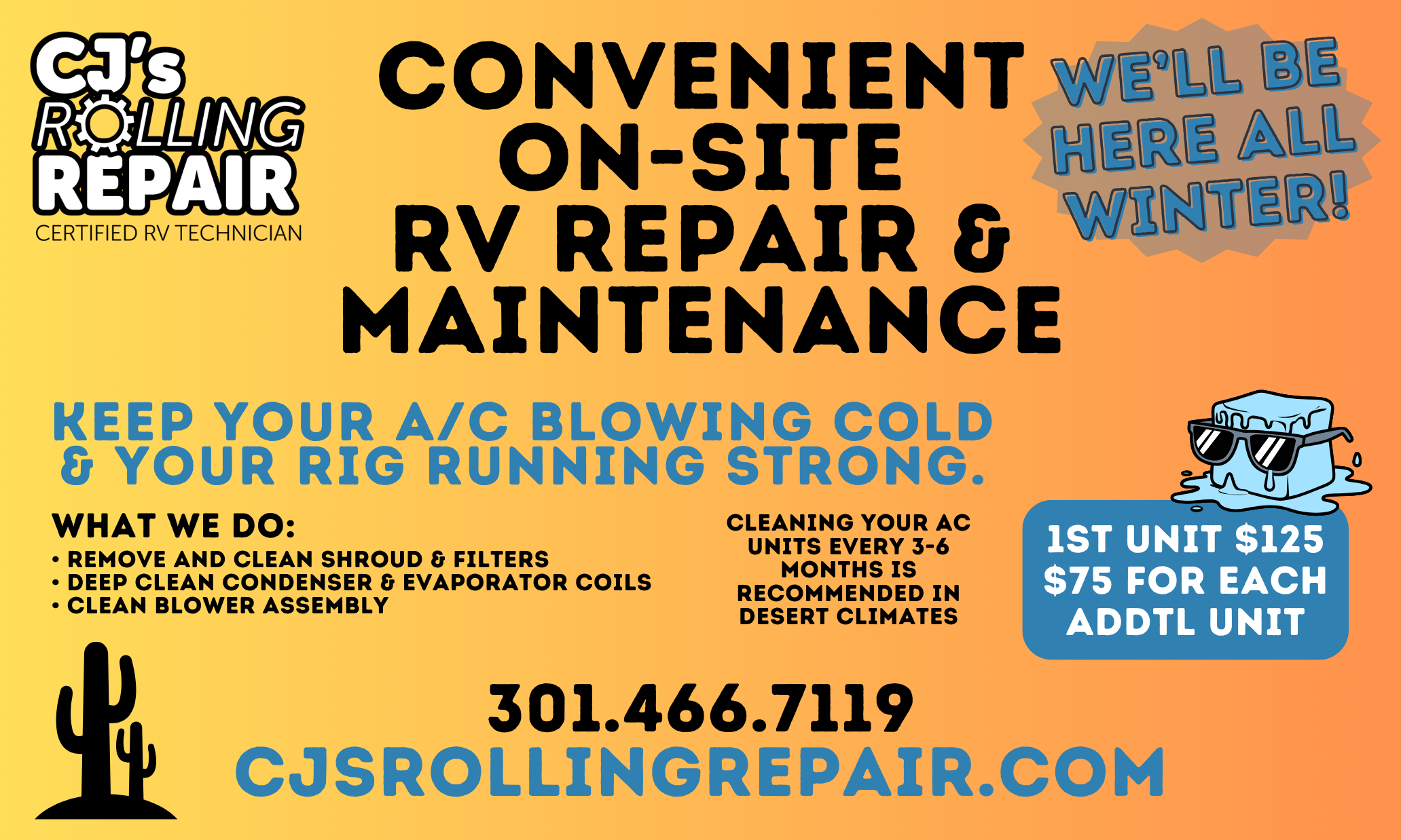 Please note: CJ’s Rolling Repair is an independent, mobile RV service and is not affiliated with The Sands RV & Golf Resort. Services are not complementary and are billed directly to residents.